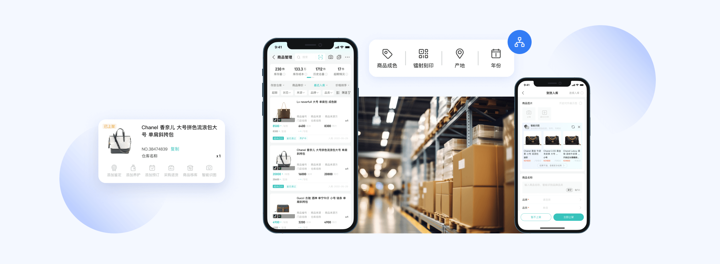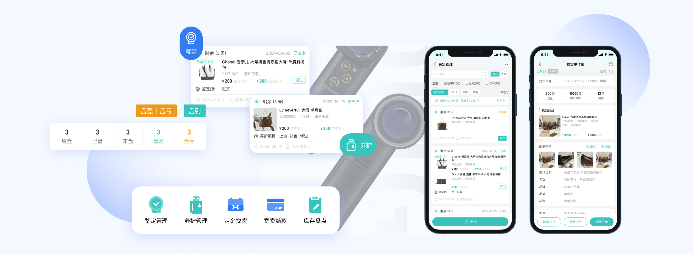 全面覆盖二奢鉴定、养护、寄卖结款等场景,跟踪商品的业务流程、来源去向、交易记录。实现全方位、标准化、数字化经营管理。